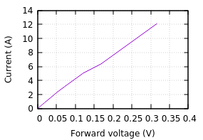 My breadboard testing achieved a forward drop of 0.31V at 12A, which is comparable to the best Schottky diodes at that current - but this was on breadboard with considerable resistance, and using an IRFZ44N MOSFET. Lower Ron parts are available. With a better MOSFET and on PCB, a lower drop should be easily achievable. I believe almost all of my measured drop was from the breadboard contacts.