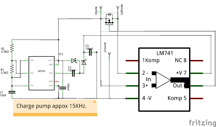 I have produced a Fritzing schematic (Plus LM741 part) and PCB layout files. I've never actually made a PCB before, but I think these will work. Don't forget the negative voltage regulator if your supply voltage might go over 20V!