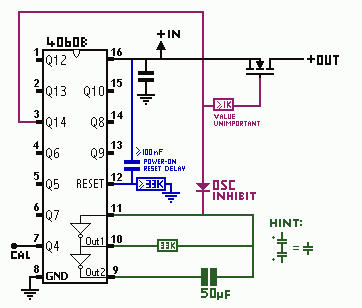 The final element is the turn-on reset circuit. While some counter chips can guarantee starting a count at zero on power on, the 4060B is not one of them: The initial state of the flip-flops is indeterminate. To fix this the reset pin needs to be held high for an instant - a few miliseconds will do - after power is applied. There is no limit on transition time, so a simple RC delay suffices. I've roughly calculated and tested that a 100nF capacitor and 33KΩ resistor will work with a comfortable error margin, but you can change these so long as the product of the two values is at least equivilant to that. A 10nF and 300KΩ will work the same, or a 3nF and 1MΩ.