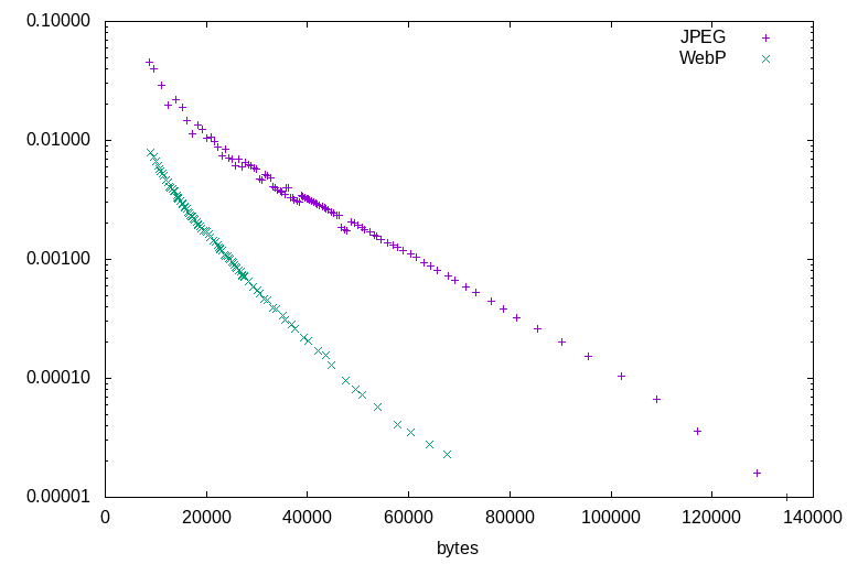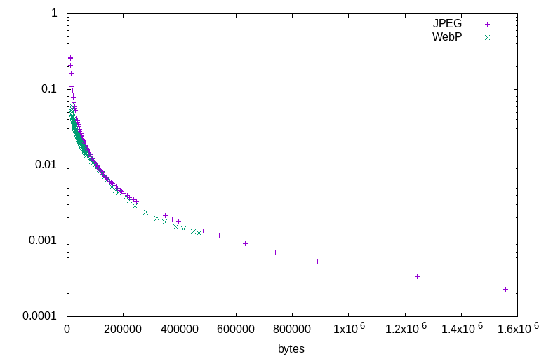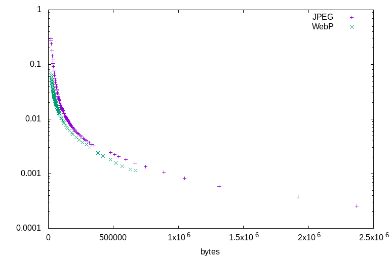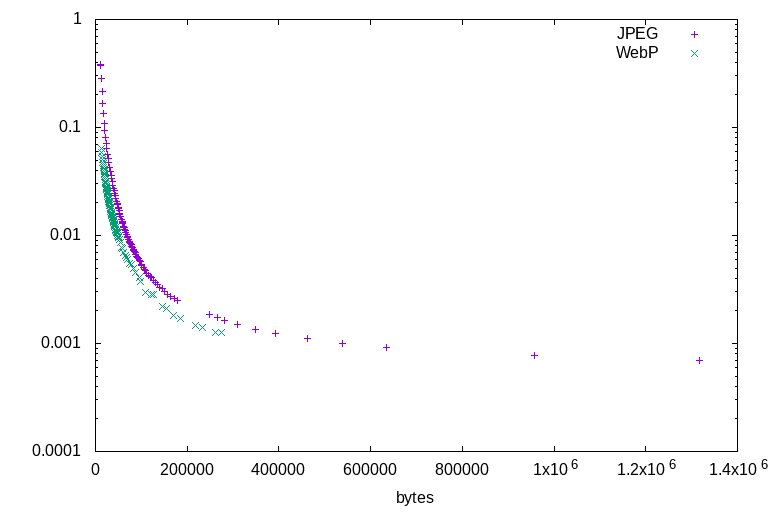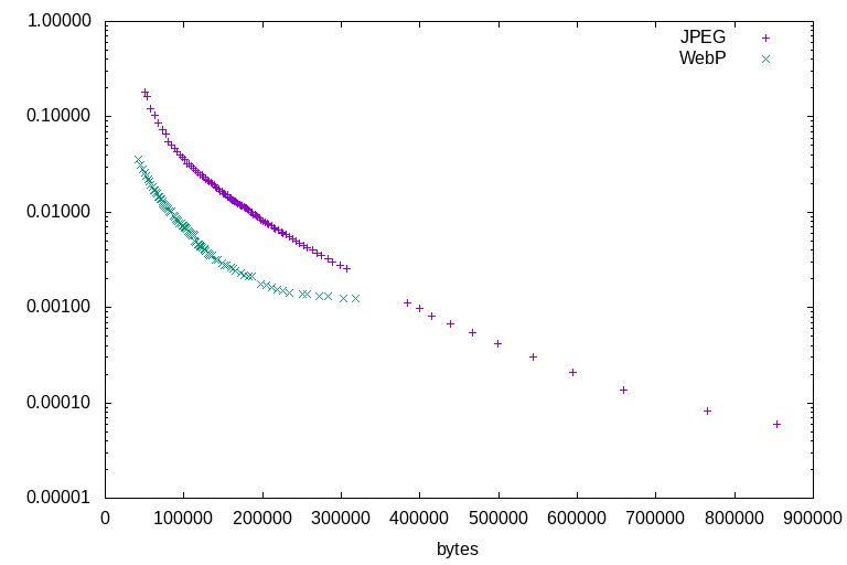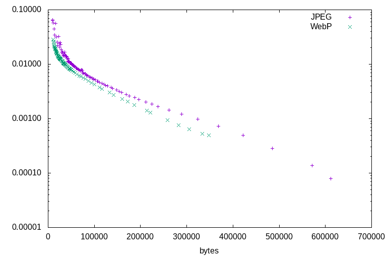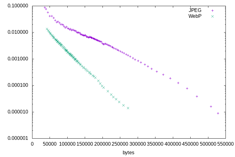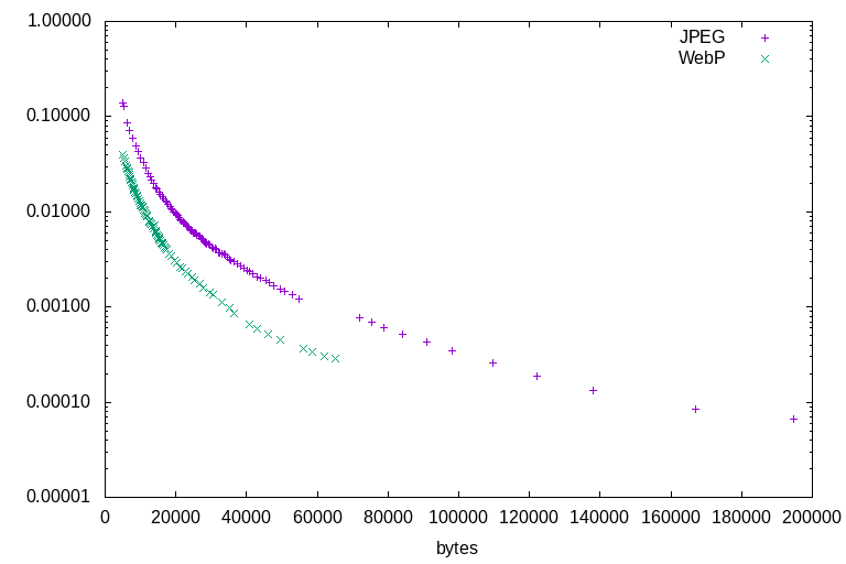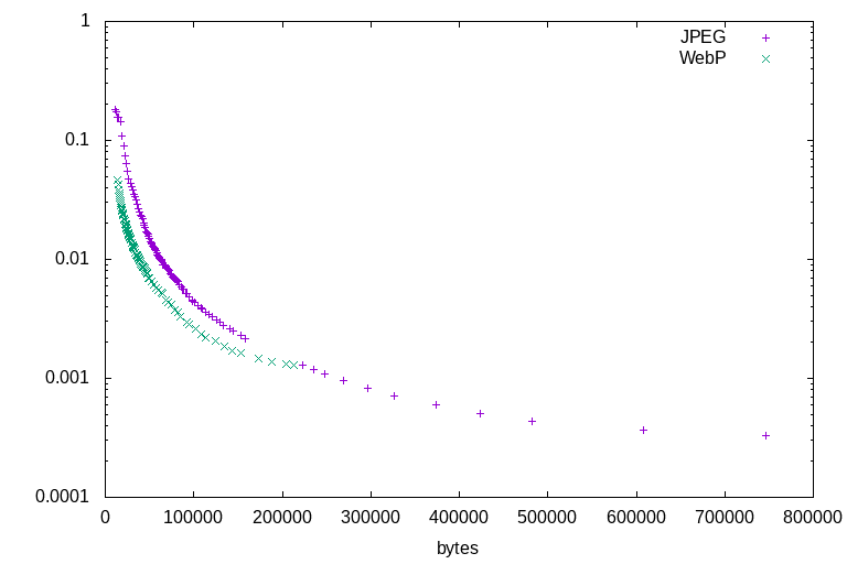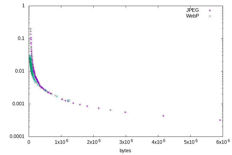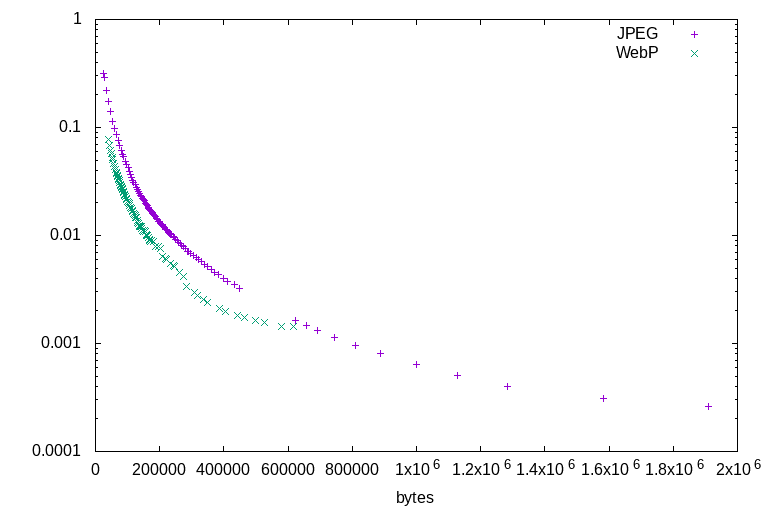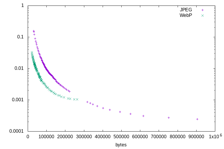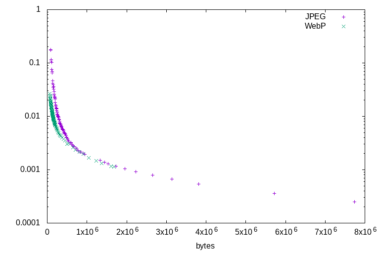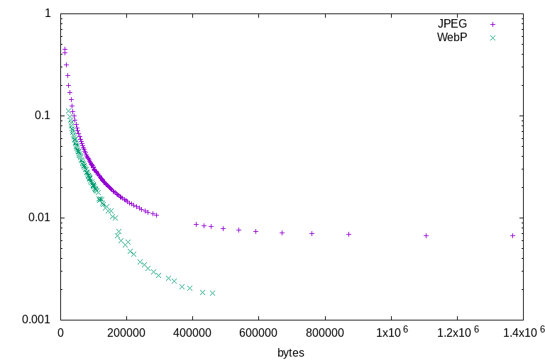 All of the illustration tests lead to the same conclusions. Firstly, that WebP outperforms JPEG at all ratios: There is not a single counterexample. At any given file size, for any of the test images, WebP will always represent a higher-quality image by the DSSIM metric. Secondly, that JPEG's highest quality settings are able to encode higher quality than WebP's highest quality settings, but at a much larger file size. For illustrations, WebP is a clearly superior format. Sometimes it wins by a wide margin, sometimes it barely outperforms JPEG - but it always outperforms.