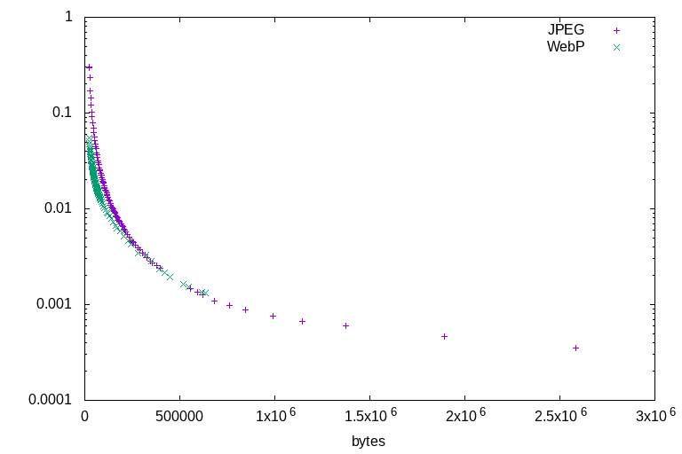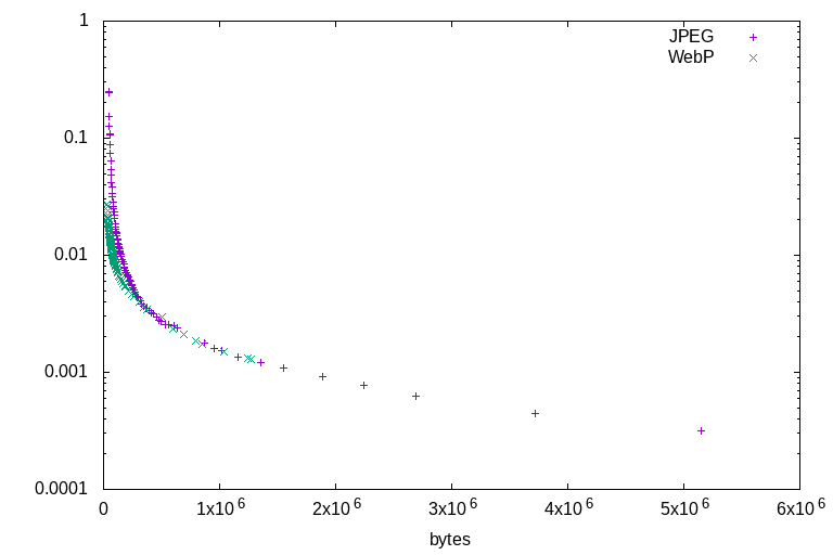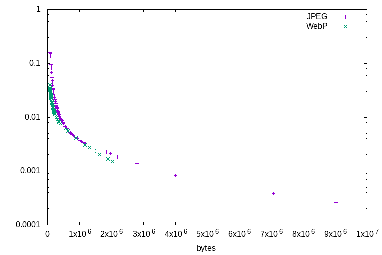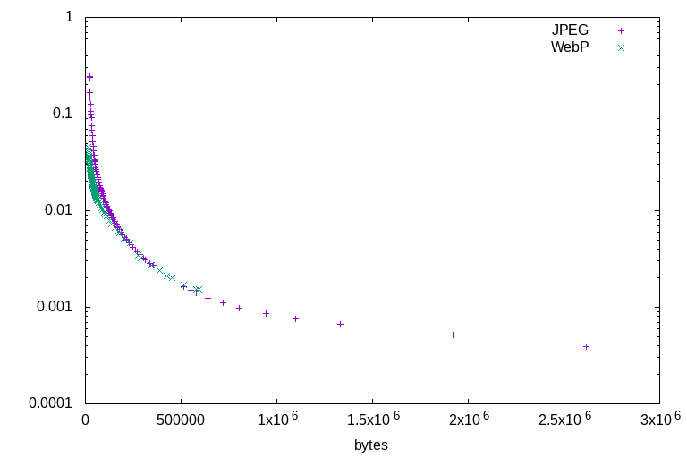 This study will measure the performance of both JPEG and WebP by plotting compression ratio against quality, as measured using the dsimm utility, at quality settings from lowest to highest. Both JPEG and WebP will be used in the most efficient manner practical in real-world situations: jpegs created by imagemagick with optimised huffman tables, and cwebp on -m 6.